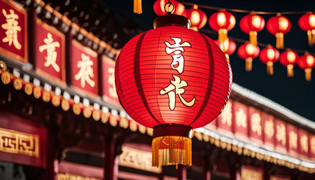 Red chinese lantern hanging over a street at night, glowing warmly for lunar new year celebrations, symbolizing good fortune, prosperity, tradition and community gathering