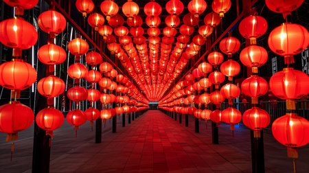 a captivating view of rows of illuminated Chinese lanterns creating a tunnel effect, perfect for evoking a sense of celebration and cultural richness