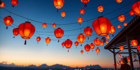 Red Chinese lanterns, sunset sky, traditional celebration, cultural background.
