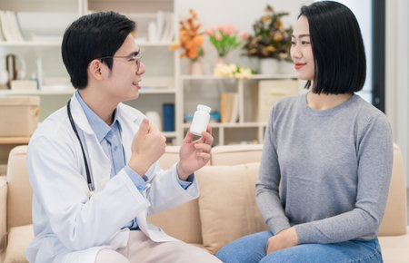 A healthcare professional in a white coat explains medication to a patient sitting on a couch in a well-lit clinic. Both appear engaged in the discussion, emphasizing personalized care.