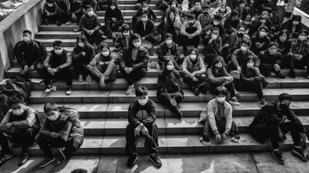 Generative AI : Group of people with face mask sitting on a staircase outdoors close up on low section body
