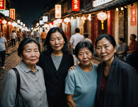 photo of senior old woman with friends in china local street market at night, generative AI