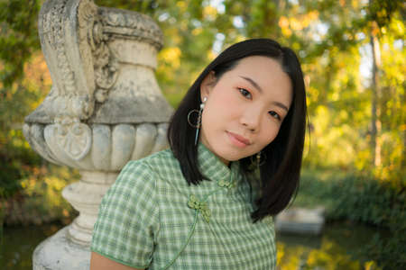 lifestyle portrait of young happy and attractive Asian Chinese woman relaxed taking a walk on city park enjoying Autumn nature during weekend getaway