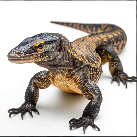 Black throated Monitor lizard with striking dark scales is moving forward against a white backdrop showcasing its unique features in detail.