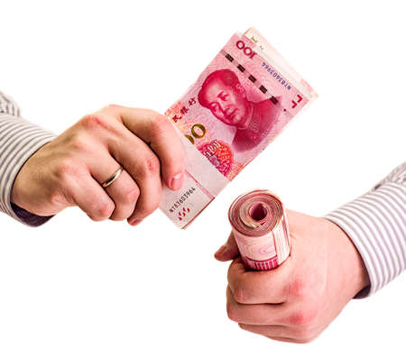 man hands counting chinese yuan bills isolated on white