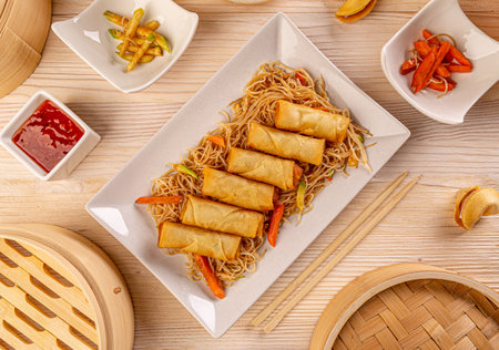 Flat lay of fresh fried Chinese traditional spring rolls food with pasta