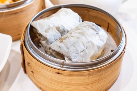 Delicious Lo Mai Gai dim sum, fresh steamed glutinous rice with chicken roll wrapped by lotus leaf in bamboo steamer in hong kong yumcha restaurant.