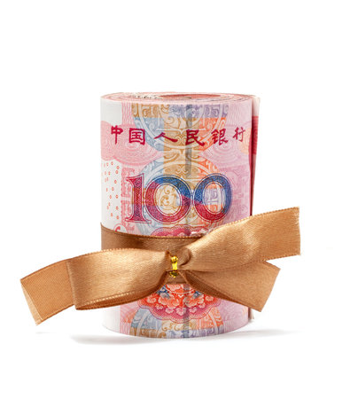 Roll of chinese yuan banknotes tied with gold ribbon isolated on white