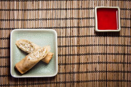 Fried chinese spring rolls with sweet chili sauce on background