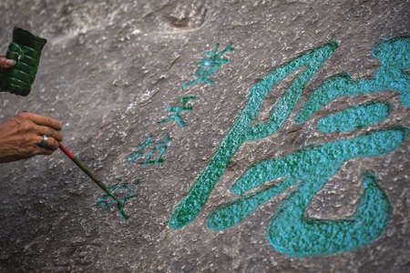 Man painting chinese calligraphy characters on a large boulder in the courtyard of a Buddhist temple at the foot of Huashan mountain, Xian, Shaanxi Province, China