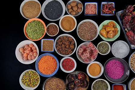 Bowls with species on black background. Hibiscus, yellow lentils, green lentils, pink arooz, star anise, chickpeas, sesame, oat seeds
