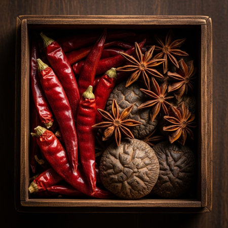 A vibrant overhead shot showcases a diverse collection of dried spices and herbs, including chilies, cardamom, cinnamon, and star anise.