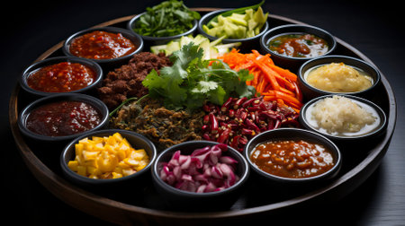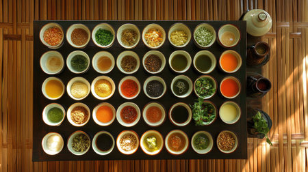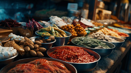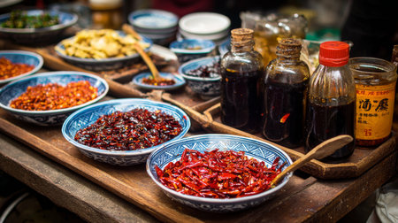 A vibrant display of spices and sauces in traditional bowls showcases the rich culinary diversity found at vibrant market stalls, perfect for food enthusiasts and chefs.