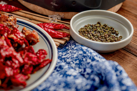 A beautiful display of spices arranged in bowls on a rustic wooden table, evoking the warmth and richness of culinary traditions in a cozy kitchen setting.