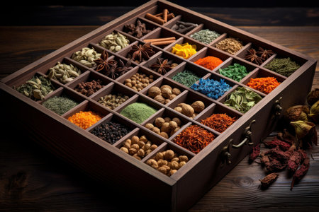 Spices colorful top view in different boxes. Aroma spice powder herb vibrant. Generate Ai