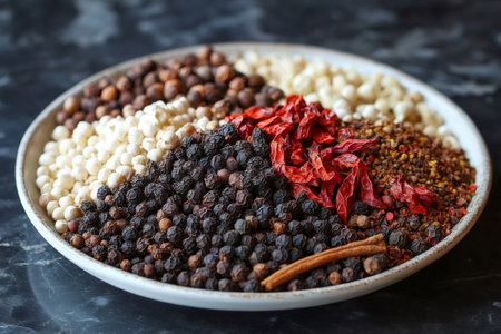 Plate containing a mix of colorful spices including black pepper, white pepper, cayenne pepper, cinnamon and other spices