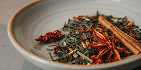 Dried Tea Mix with Anise Stars and Aromatic Herbs on Ceramic Plate