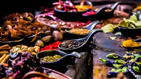 Bowls of various aromatic spices and culinary herbs. Different seasoning - red hot pepper, paprika, anise, saffron, black seeds, nutmegs, cardamom pods, thyme, gloves, curcuma. Condiments for cooking.