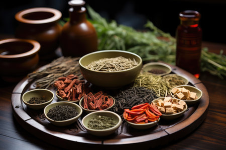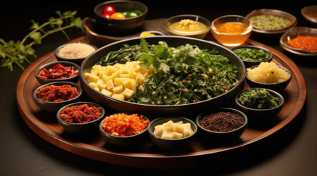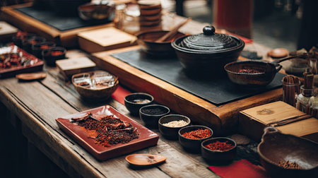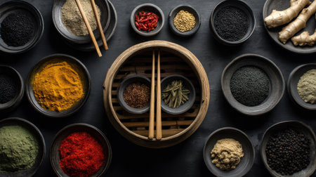 A vibrant arrangement of fresh herbs and spices displayed in traditional bowls on a rustic wooden table, perfect for enhancing culinary creativity and inspiration.