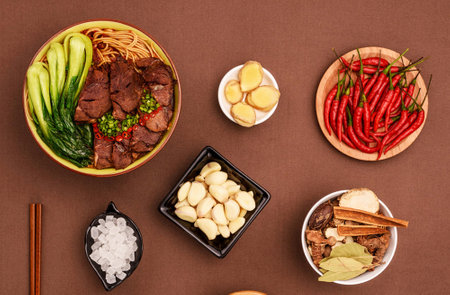Top view of ingredients for spicy stir-fried beef in bowl on brown background