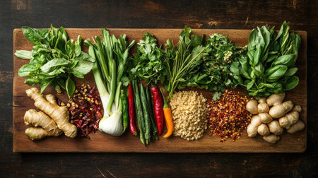 A top view of a variety of Thai herbs and spices, such as lemongrass, galangal, Thai basil, and bird's eye chili, arranged on a wooden board