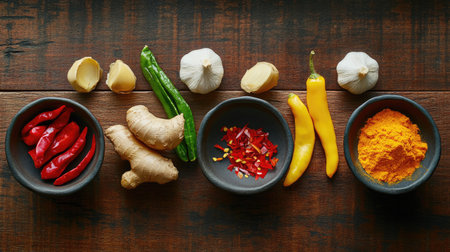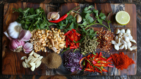 A colorful array of Thai spices and herbs, including garlic, arranged on a wooden cutting board, ready for culinary exploration.