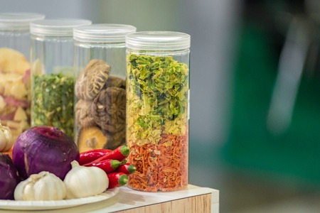 Dried vegetables in glass jars, onions, beets, carrots, pumpkin, bay leaf, banks on straw napkin and wooden background. Superfoods, herbs
