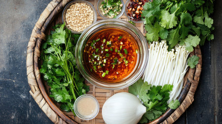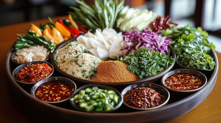 A beautifully styled platter featuring a selection of chili sauces, spices, and fresh herbs, perfect for a gourmet dining experience and showcasing vibrant culinary ingredients.