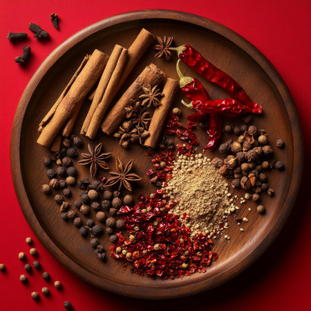 A variety of aromatic spices including cinnamon, chili, and anise artfully arranged on a wooden plate, set against a striking red background, showing vibrant culinary elements.