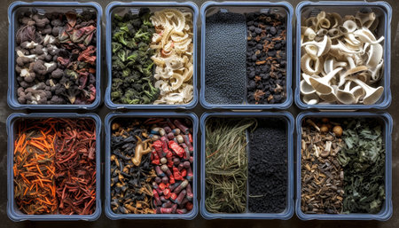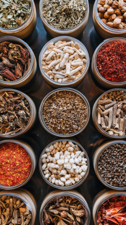 A variety of spices and herbs are neatly displayed in jars, offering a top-down view. the assortment highlights vibrant colors and textures, enhancing culinary inspiration.