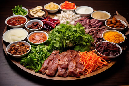 A vibrant Asian food platter featuring fresh vegetables, dumplings, and a variety of colorful dips. Perfect for sharing and enjoying delicious flavors.