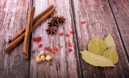 Exotic herbal Food concept Mix of the organic Spices cinnamon stick, cardamom pods, bay leaves, star anise on wood background