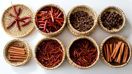 Brightly colored woven baskets are symmetrically placed on a white surface, showcasing an array of dried chili peppers, fragrant cinnamon sticks, and aromatic cloves, creating a vibrant still life.