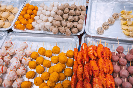 This enticing array of street food skewers showcases a delightful mix of grilled and fried treats, perfect for sharing at parties or festivals.