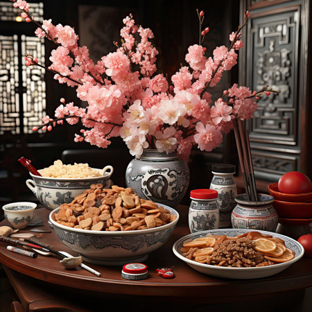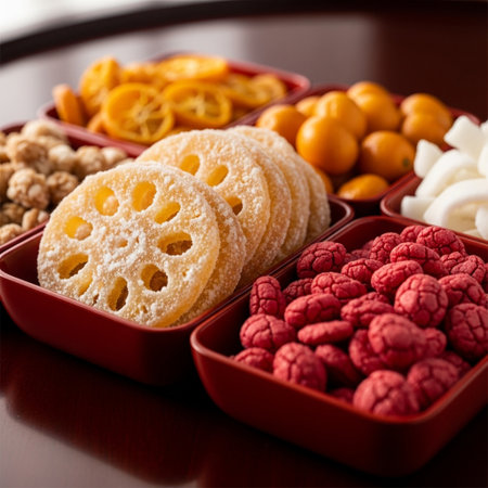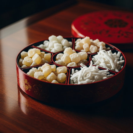 A striking vertical still life emphasizing the symbolic sweets and gifts of Lunar New Year. The arra