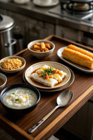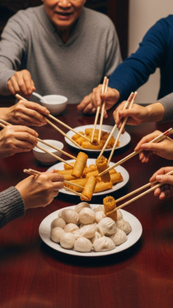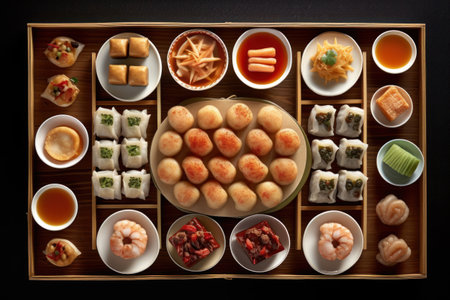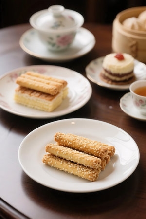 Dim Sum gathering, featuring a variety of small, intricately arranged dishes on a rustic wooden table, including steamed buns with golden brown tops, delicate dumplings wrapped in translucent wrappers.