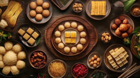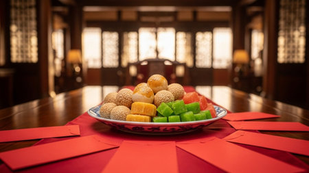 A vibrant Chinese New Year dessert table awaits! Lucky red envelopes, nian gao, tangyuan, mandarin oranges, and other auspicious treats symbolize good fortune, prosperity, and family unity Experience the delicious flavors and vibrant colors of this authentic celebratory feast a visual guide to traditional sweets Celebrate the Year of AI Generative