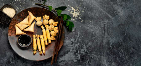 Different types of dumpilns on gray background. Traditional asian food cocnept. Top view, flat lay, copy space