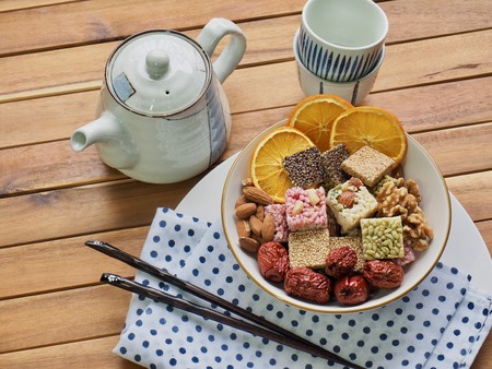 Korean traditional snacks Sweet Rice Puffs, Gangjeong and Nuts and Dried Orange and Jujube