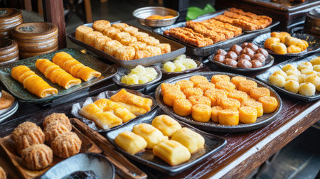 An inviting display featuring a variety of exquisite Asian desserts and snacks, showcasing vibrant colors and enticing textures, perfect for food lovers.