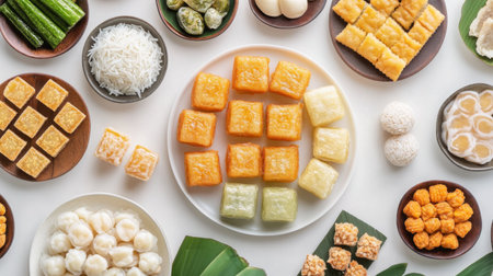 A creative flat lay of traditional Thai sweets, including crispy rice cakes and sweet mung bean cakes, arranged attractively on a white surface to capture their variety.