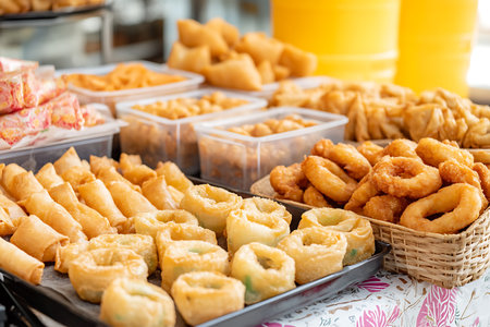 A close-up captures a colorful and delectable assortment of southeast asian fried snacks and desserts, including spring rolls, fried donuts, and sweets at a market.