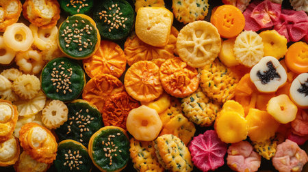 A vibrant assortment of colorful Asian snacks features a variety of textures and flavors. Perfect for food enthusiasts and culinary inspiration.