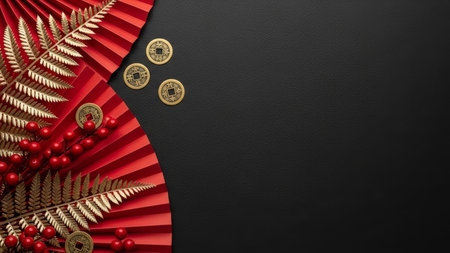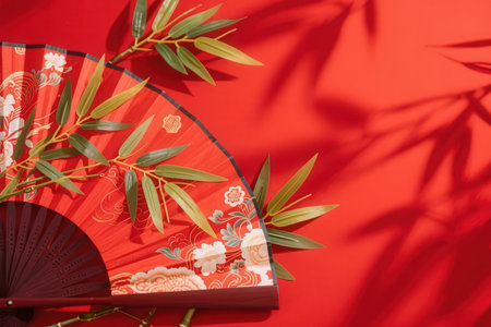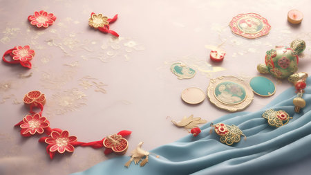 chinese new year background, asian style doll and flower fan, copy space, place for text