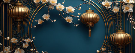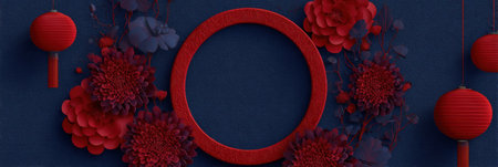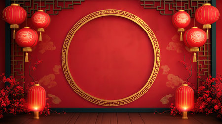 Bright red circular frame surrounded by colorful lanterns and blooming flowers creates a joyful atmosphere for celebrations.