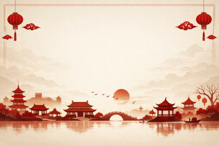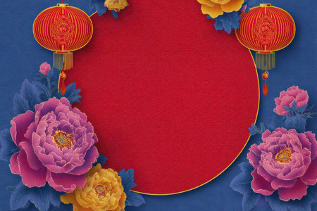 A festive red frame with lanterns and flowers shines against a blue background, creating a joyful scene.