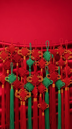 This image showcases decorative red tassels featuring a golden clasp and wooden beads against a vibrant red background, ideal for cultural themes.