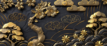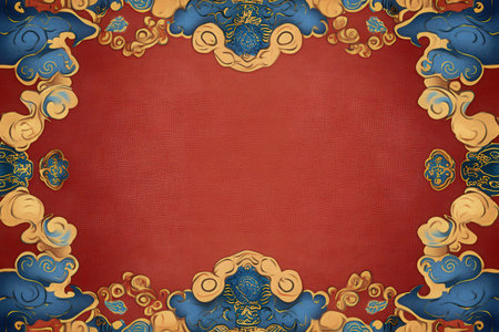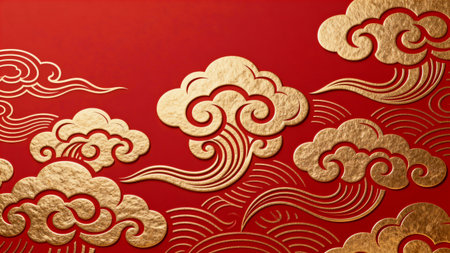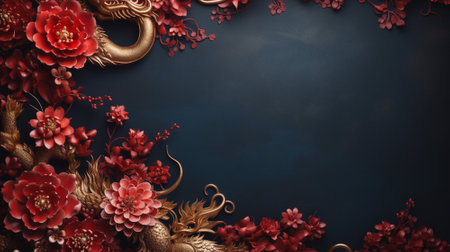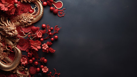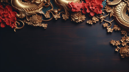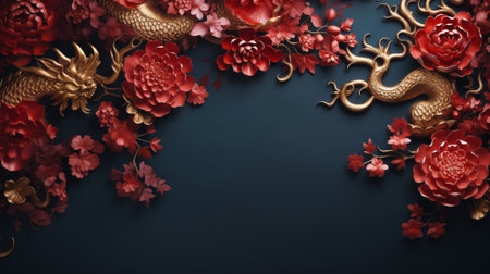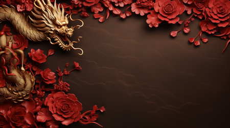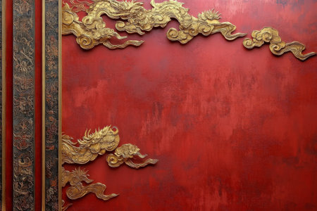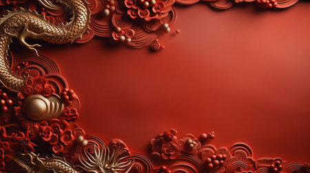 A rich red backdrop features intricate gold designs including dragons and clouds, creating an elegant atmosphere ideal for celebrations or cultural events.