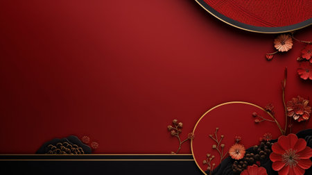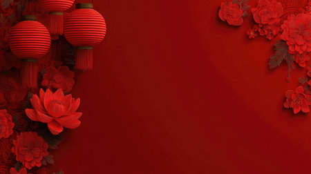 Vibrant red background displays a decorative floral design, including intricate flowers and hanging lanterns. The design elements are arranged in a corner of the composition, leaving ample space for copy or further design elements. The texture of the design conveys a sense of intricacy and detail.