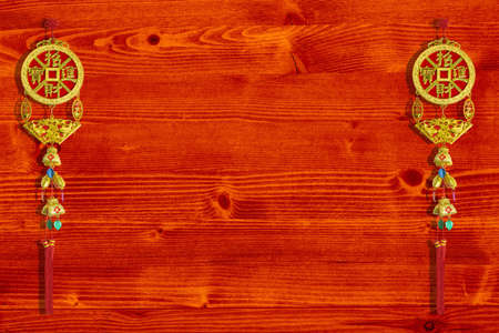 Chinese good luck symbols on wooden background, Chinese new years concept.